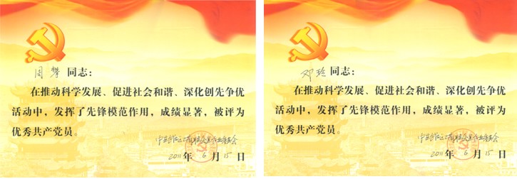 2011年6月,周攀、邓玲同志被中共武昌区工商联会员企业委员会评为“优秀共产党员”