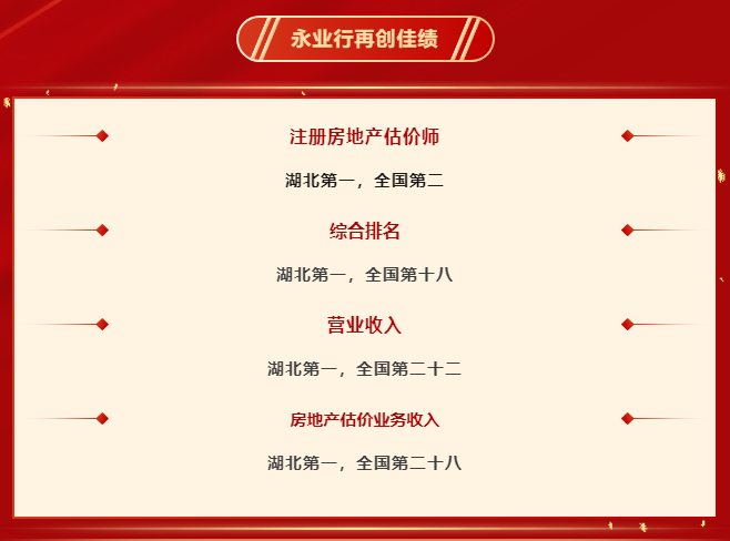 2024年9月9日,中国房地产估价师与房地产经纪人学发布《关于发布2023年度全国一级房地产估价机构有关情况的公告》(中房学〔2024〕34号),永业行再创佳绩,综合情况全国领先,湖北第一,营业收入与房地产估价业务收入双提升。