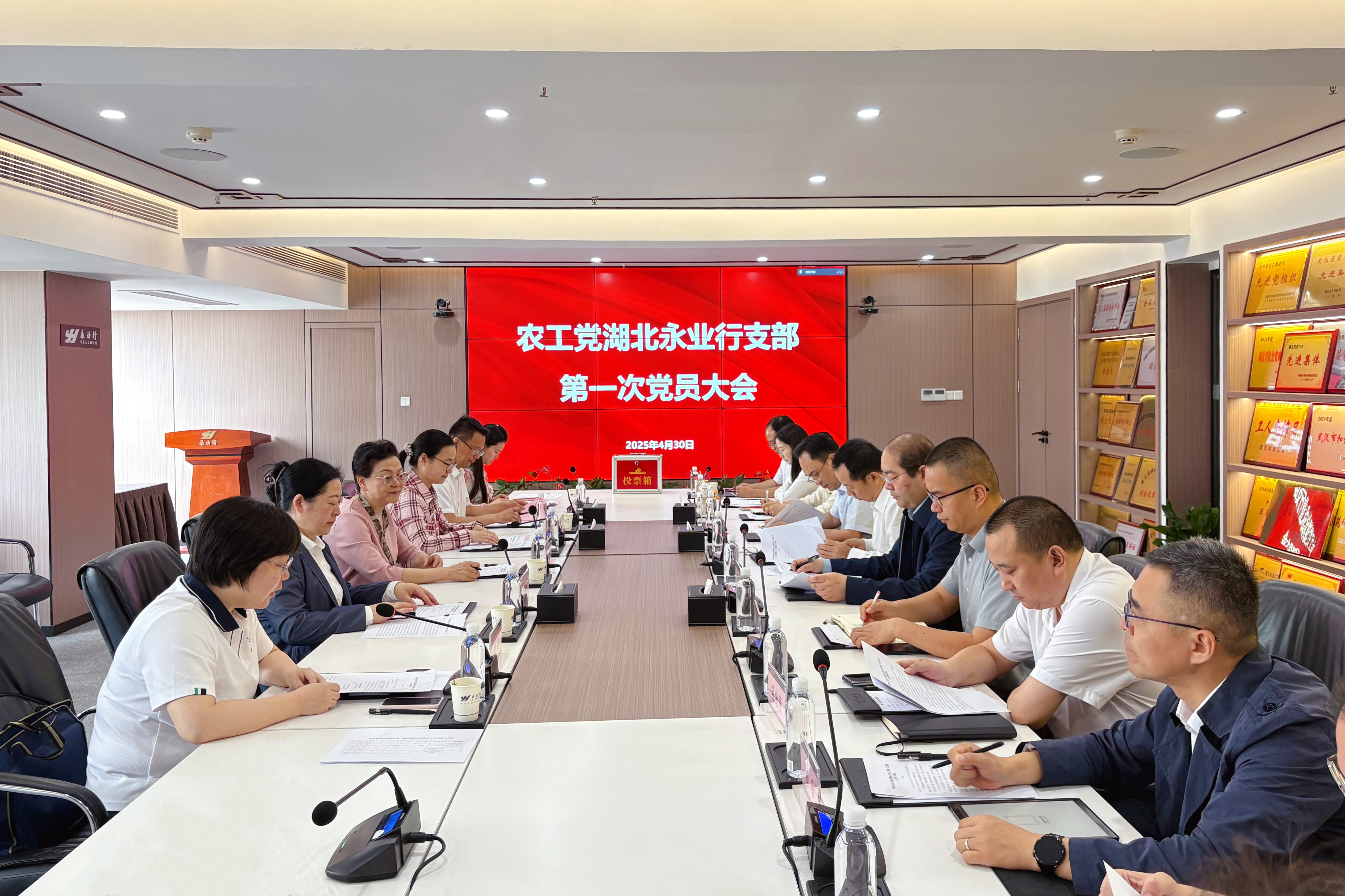 2025年4月30日,农工党湖北永业行支部第一次党员大会在永业行举行。湖北省政协常委、副秘书长、农工党湖北省委会专职副主委黄惠宁,农工党湖北省委会组织部部长宋亚琼到会指导,会议由农工党湖北省委会组织部副部长刘弥主持。永业行党委书记、董事长潘世炳出席会议并致辞,永业行党委委员、常务副总裁吴学锋参加会议。